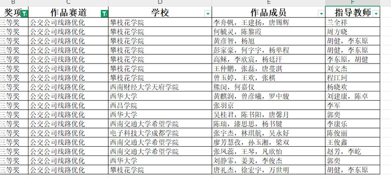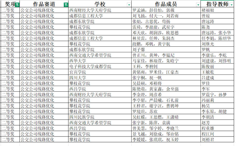 其他获奖成绩同样亮眼:在“公交公司线路优化”题目中,由马家佳、林瑞萱、朱晗宁同学组成的团队获得二等奖,刘静霏-姜美-李俊杰小队、黄麒润-曾彦曦-罗中骏小队获得三等奖;在“川滇民族文化问答系统”题目中,黎豪杰、黄俊杰、王永仪同学组成的团队获得三等奖。这些成绩充分体现了我校在数据科学和人工智能领域人才培养的广度与深度。